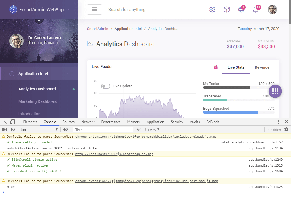 This template and projects demonstrates the core principles and concepts of how you can integrate SmartAdmin 4 with your favorite backend platform. We aim, and do our best, to create a reference project based on community adopted guidelines and principles. That said, with our years of experience and our focus on quality we believe that this template will provide you with a great starting point that you can use for your own project purposes and customizations.
