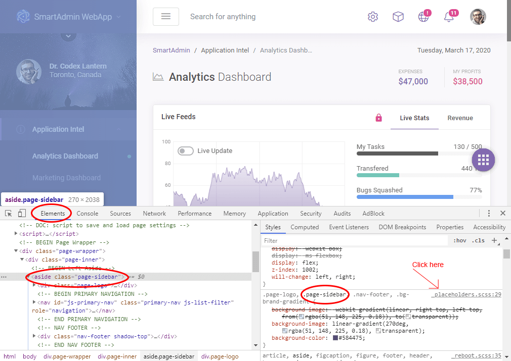 page-sidebar) you wish to manipulate, once selected it will reveal the SCSS file from the CSS maps (to the right). Locate the reference for the CSS class (eg..page-sidebar) to reveal the SCSS file name where these classes are residing. In this example below it is residing inside_placeholder.scssin line 29. Clicking on the file name as shown in the image below...