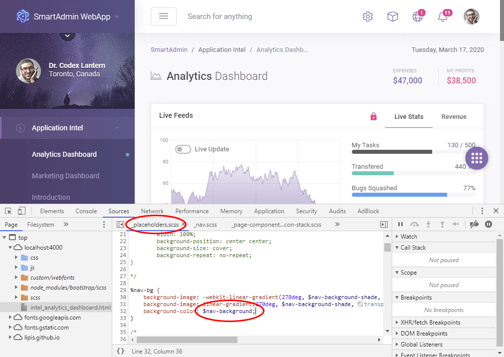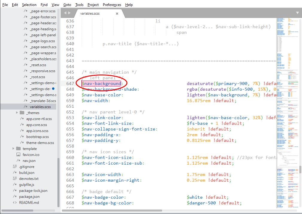 _placeholder.scssfile from the previous window, you will see the variable you need to change for the left navigation background color. In this example it will be$nav-background
